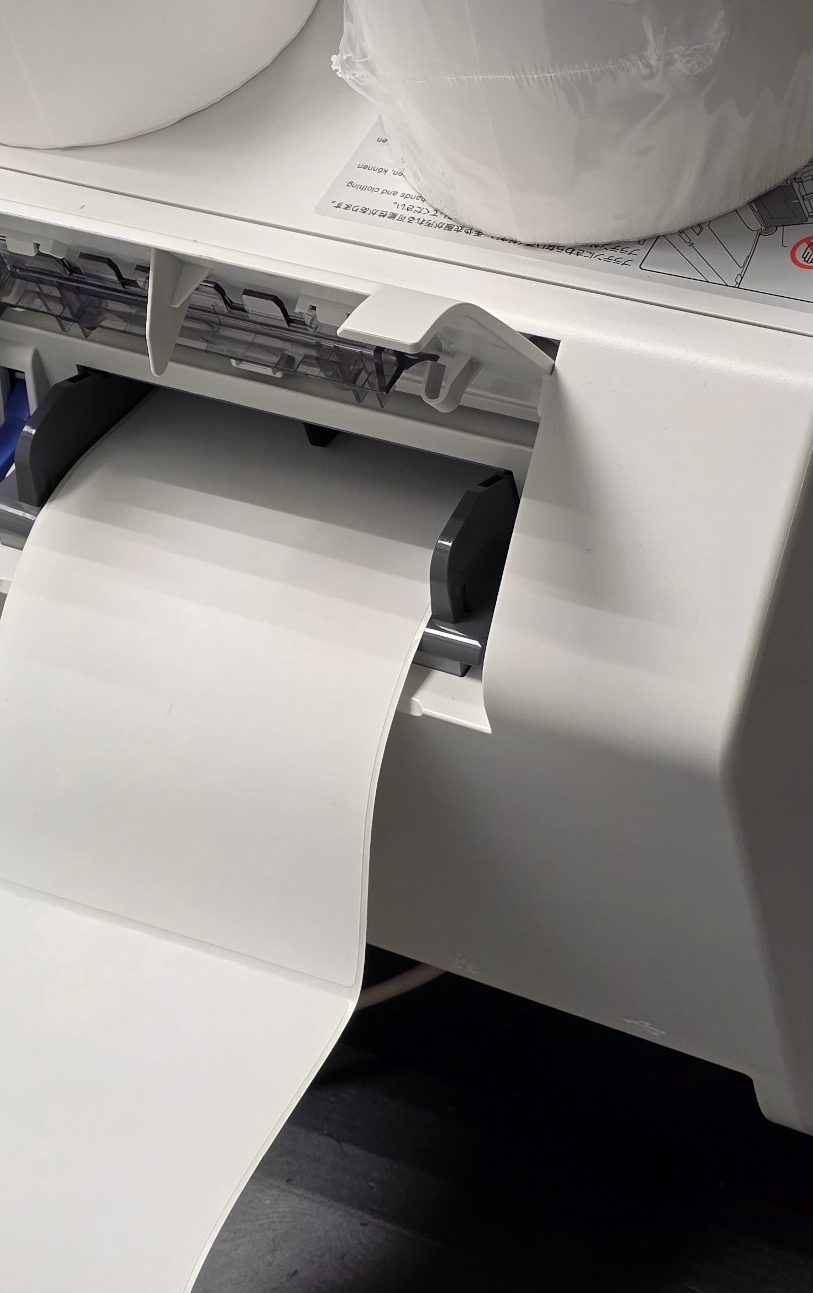 Этикетки не имеют разделения (сплошная намотка 50 метров): принтер сам отрезает необходимую длину. Материал — глянцевая прочная бумага (если отрывать, наклейка снимается полностью как винил, хотя не такая крепкая). Подходят для пигментных и водорастворимых (водных) чернил.