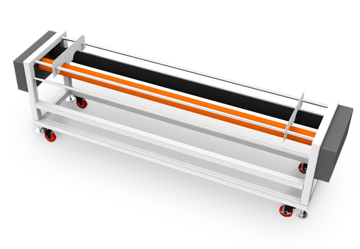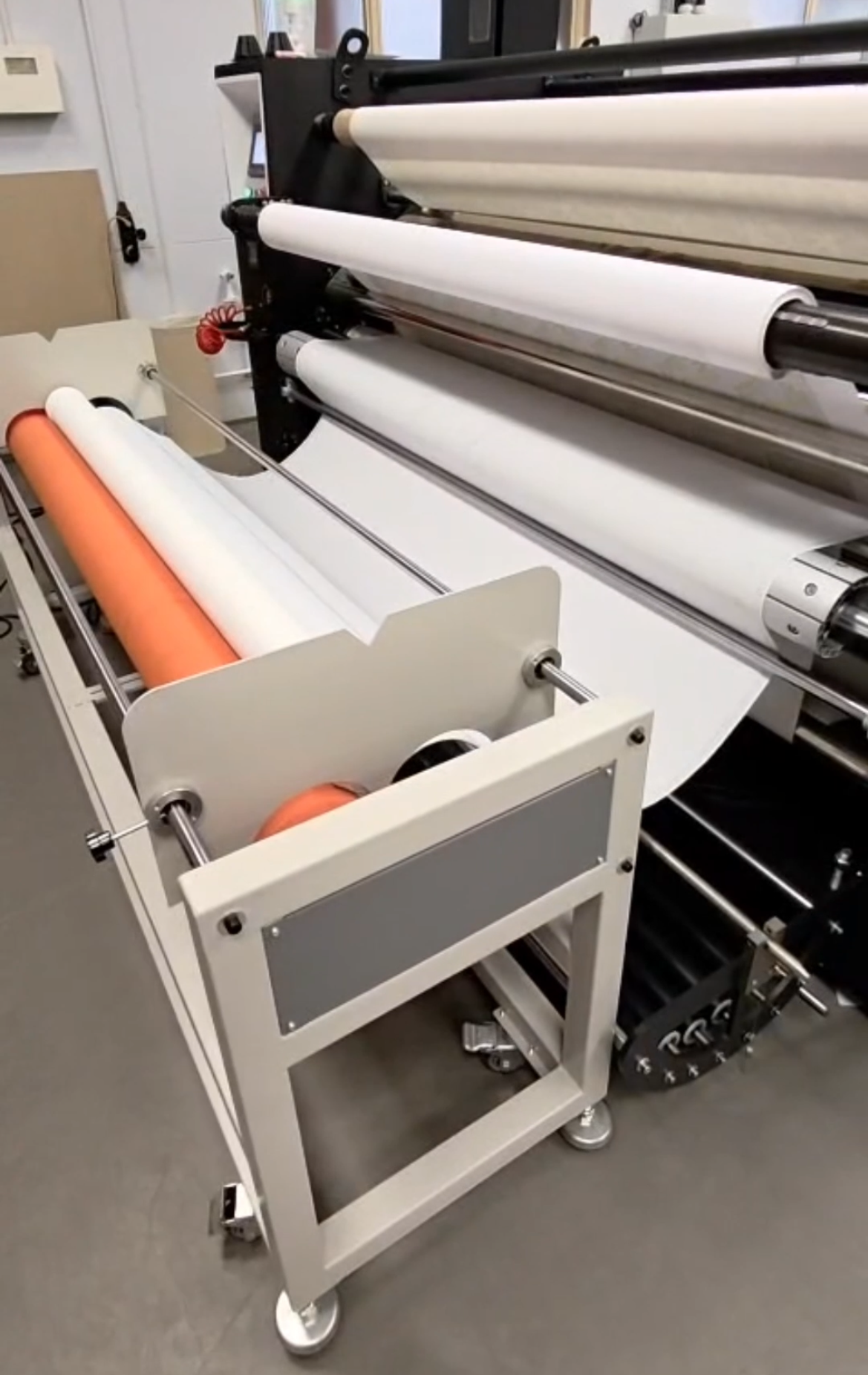 Отработанная сублимационная и защитная бумага сматываются в рулоны с помощью пневмовалов, которые быстро и удобно фиксируют рулоны. Устройство оснащено независимыми двигателями для смотки использованной сублимационной и защитной бумаги.